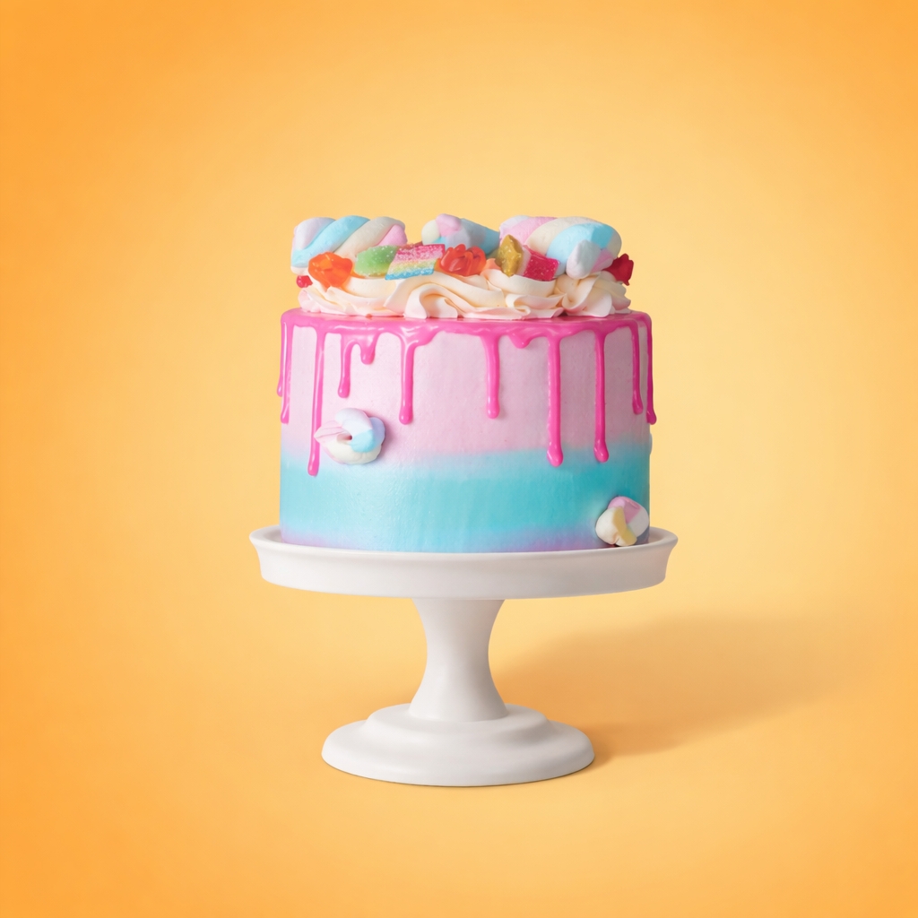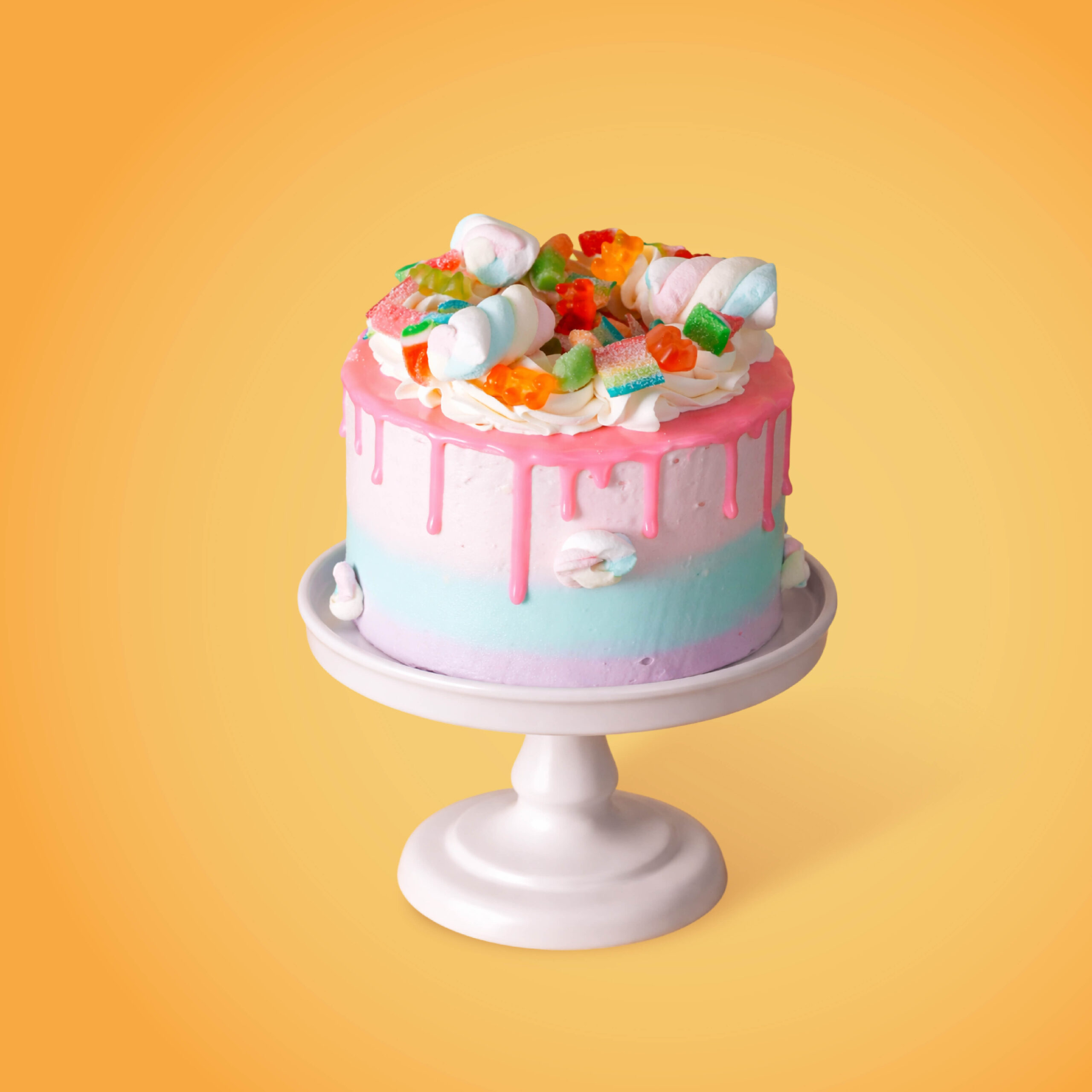 Pastel cubierto de buttercream y chocolate color rosa, decorado con ricas y divertidas gomitas ácidas.