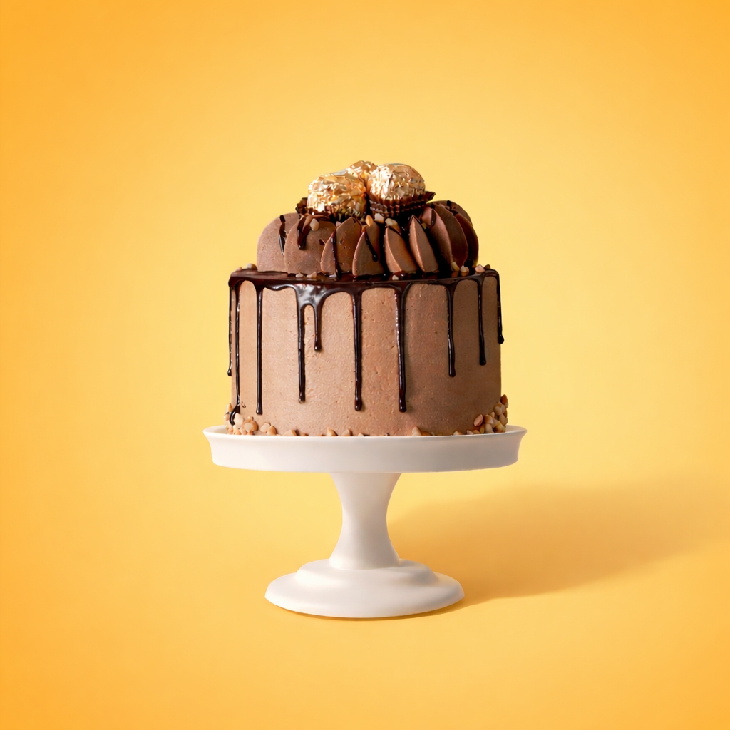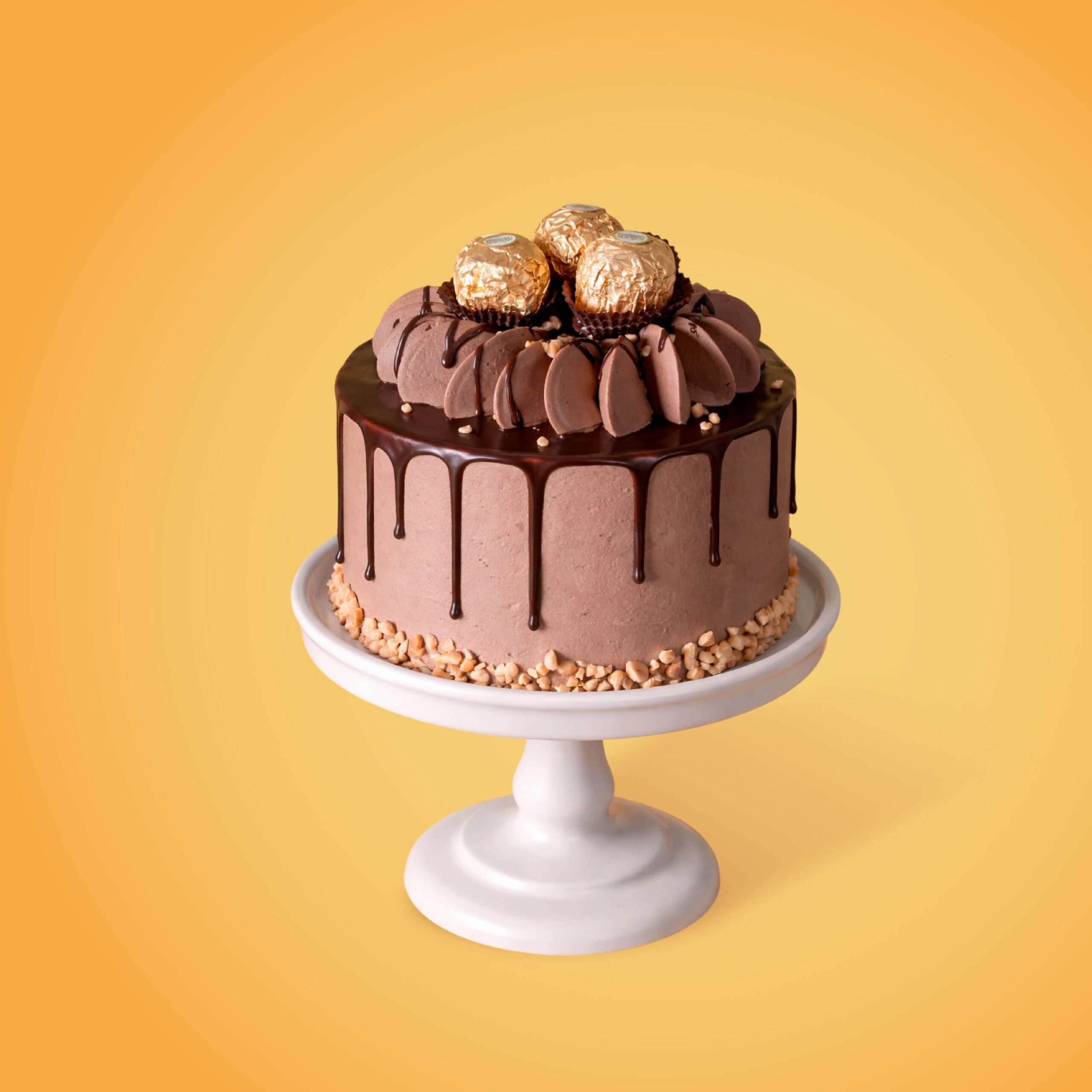 Pastel cubierto de buttercream y ganache de chocolate oscuro, decorado con elegantes chocolates Ferrero y trocitos de maní.